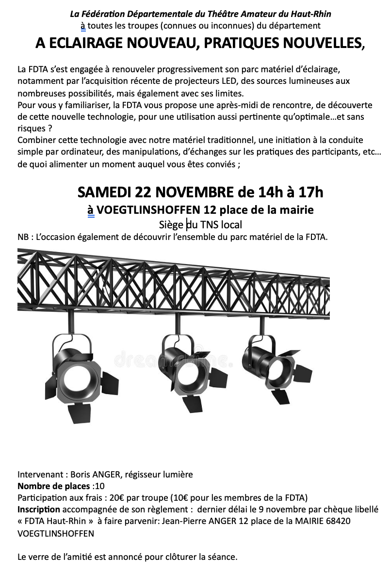 Un lieu de formation : stages propres à la fédération ou proposées par les troupes : jeu (acteurs, mise en scène), techniques de scène (lumière,